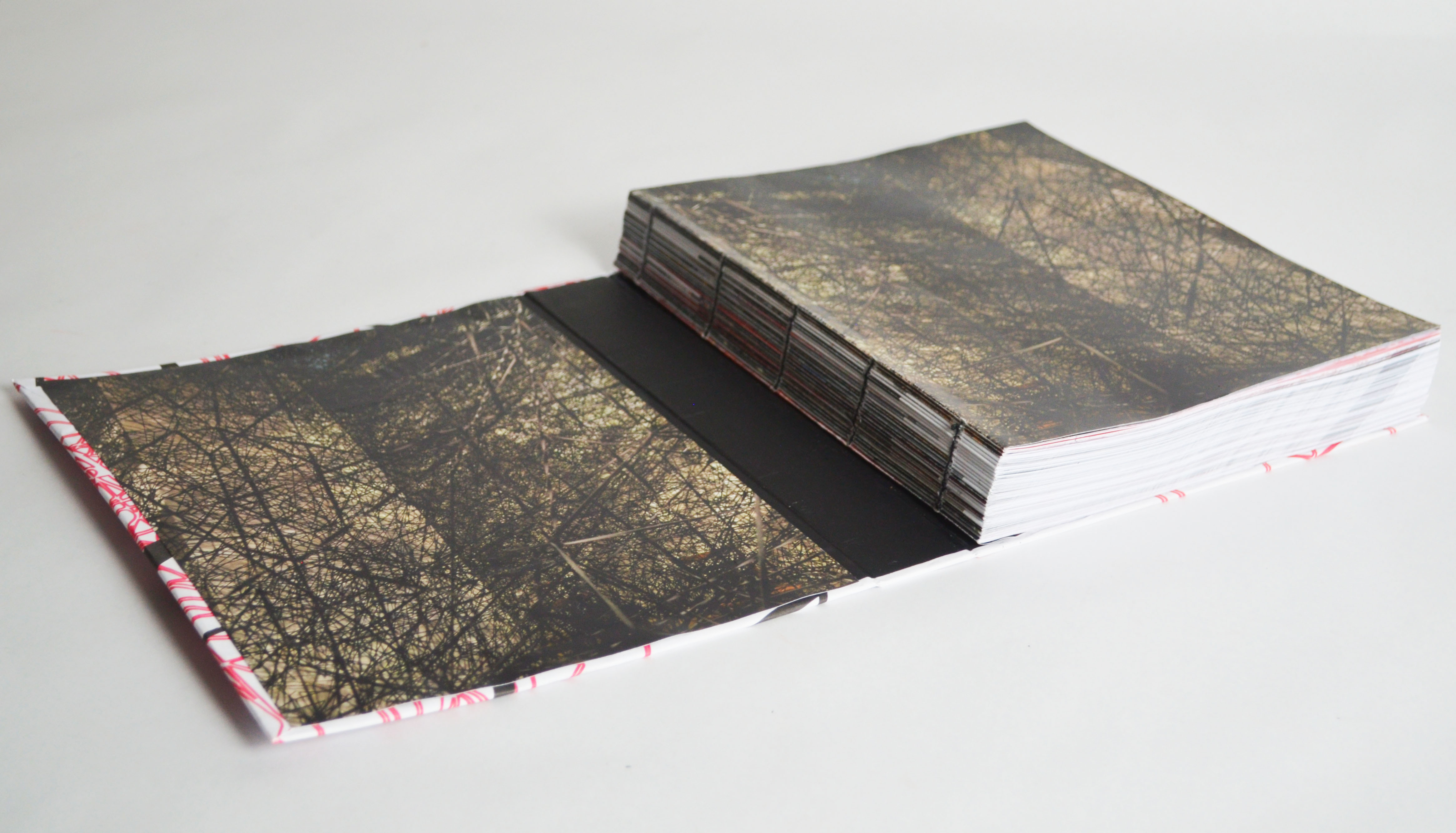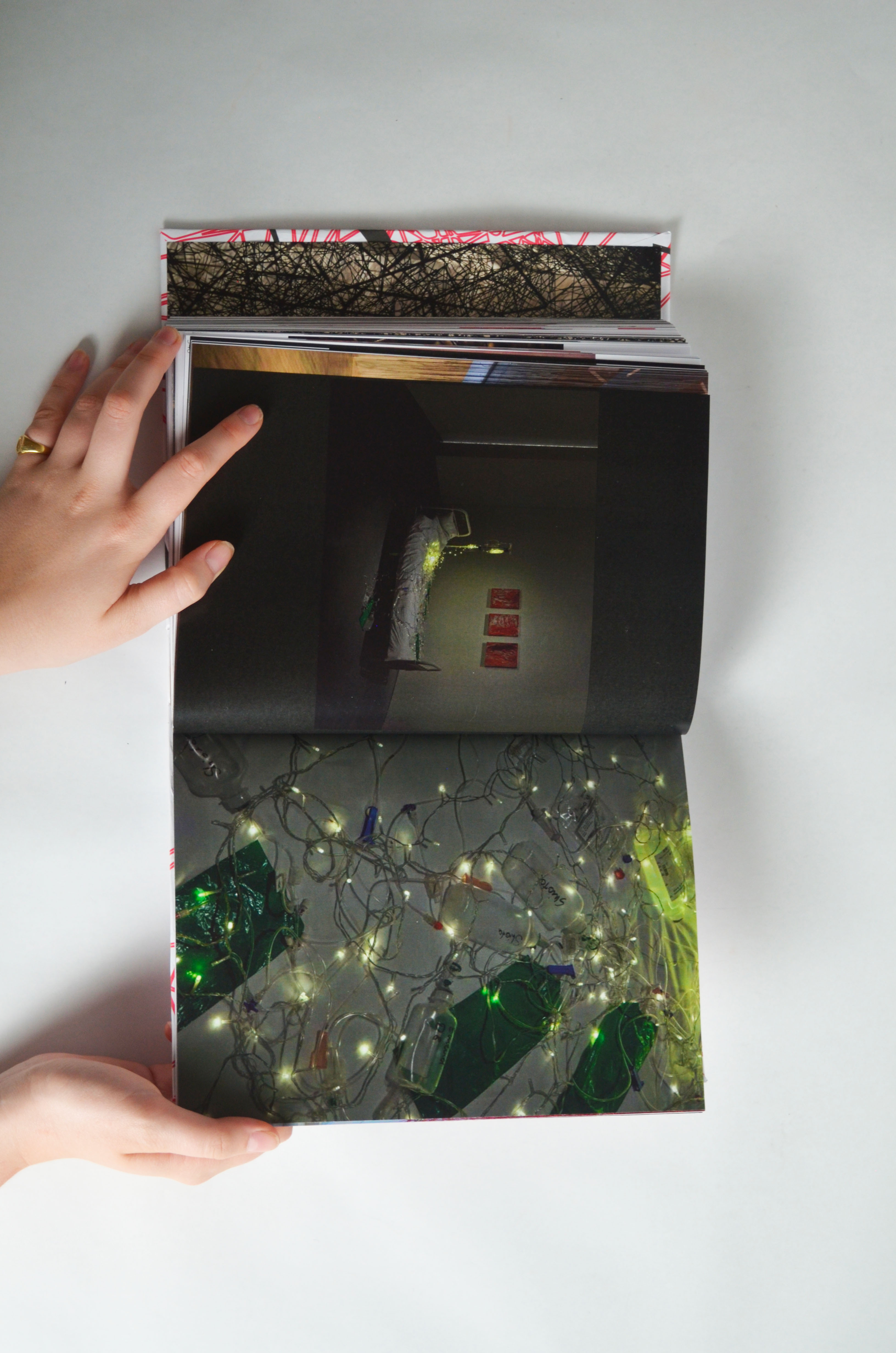 Dans la seconde édition, j’ai voulu mettre en avant la rupture entre sa pratique de la peinture et celle de l’installations, dans un format A5, reliure agrafée, elle possède une couverture en rhodoid rouge qui aplatit la couverture comme la peinture est aplatie par rapport aux installations.